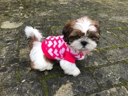 Beautiful puppy Poppy loves her extra small Cerise Heart jumper!! She’s only 9 weeks and it keeps her warm and snug!